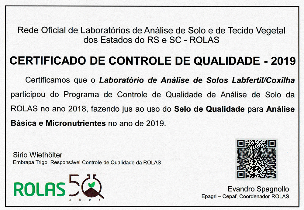 Esse certificado é emitido pela Sociedade Brasileira de Ciência do Solo e coordenado pela ESALQ e se refere aos resultados do biênio 2015/2016.